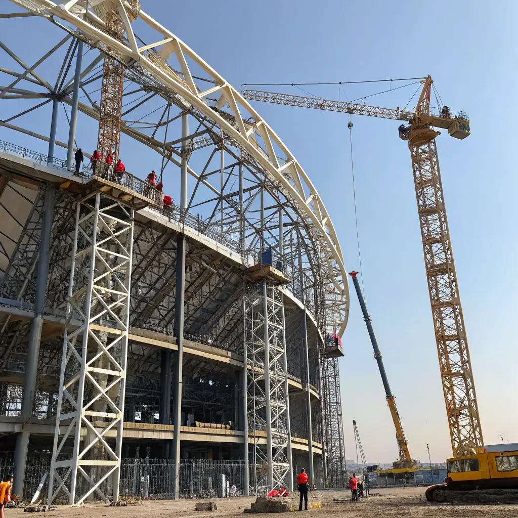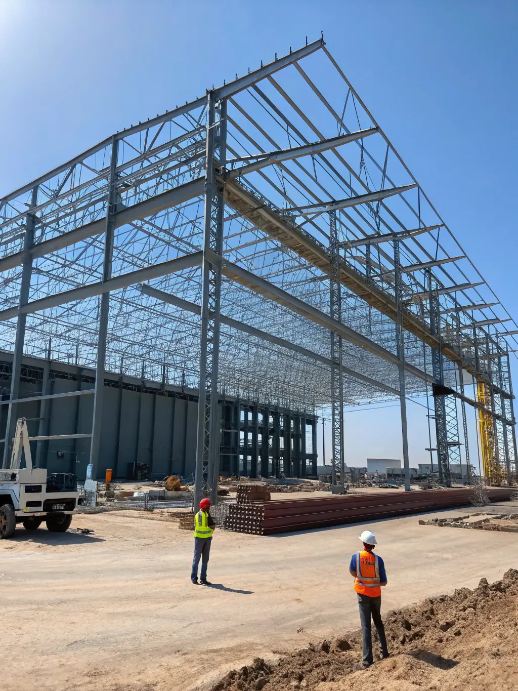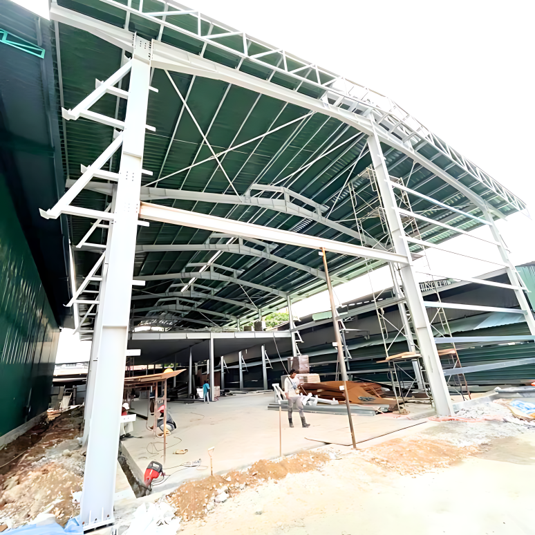 This project involved the steel-framed industrial facility or warehouse featuring a curved metal roof supported by white steel columns and trusses. The structure is partially completed, with visible construction materials and scaffolding on-site. The design offers a spacious, high-ceilinged interior, making it ideal for storage, manufacturing, or industrial applications.