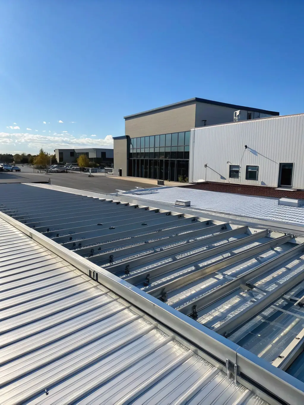 We designed and installed steel truss roof with a modern, durable metal sheet covering, supported by sturdy white-painted columns.